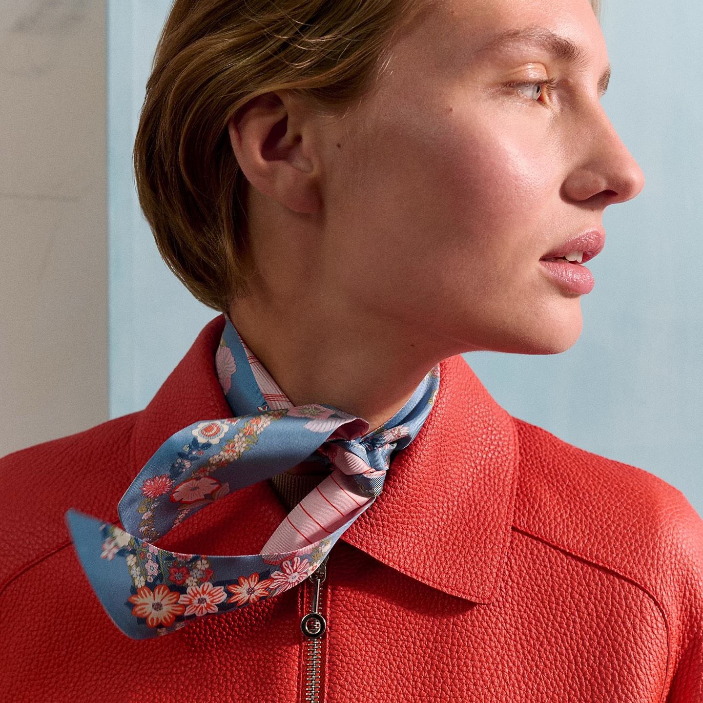 「華やかな手綱フラワーバージョン」スカーフのデザインからインスピレーションを受けて制作された本スカーフは、「華やかな手綱」の原柄を再構想し、フラワー(花卉)とフルーツ(水果)で原版デザインのラインを描き出しています。クリスティーヌ・アンリー(Christine Henry)とユーゴー・グリガール(Hugo Grygkar)の創造的な才がここで融合しています。ワスレナグサ(勿忘我)、ハイビスカス(木槿花)、フヨウ(芙蓉花)と、ブルーベリー(蓝莓)、イチジクの木(无花果树)が交互に組み合わさり、心を打つ田園交響曲を奏でています。馬術用のバックルストラップ(马术扣带)と手綱(鞍辔)はまるで芳香を放つ花や果物の香りを漂わせ、華やかな色彩で春の訪れを迎え、詩情あふれる大自然の景色を美しく表現しています。